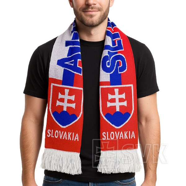Obojstranný hrubý pletený šál so strapcami a s nápismi SLOVAKIA a na oboch koncoch so znakom Slovenskej republiky. Vhodný ako reprezentačný šál pri fandení na športových podujatiach, ako suvenír alebo ako darček.